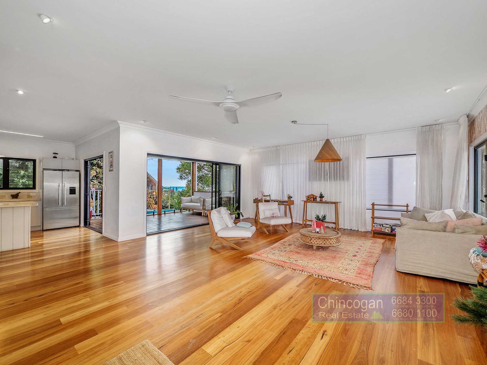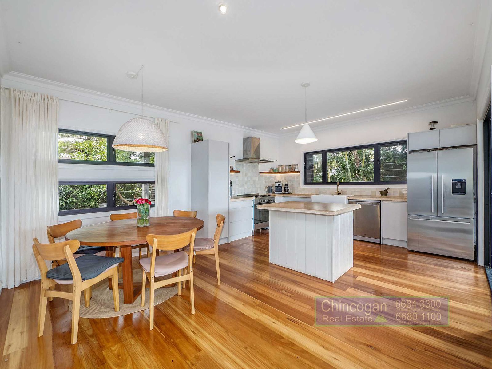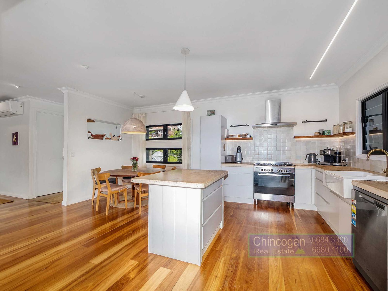- Light-filled open-plan living area with gourmet kitchen with solid hardwood floor throughout